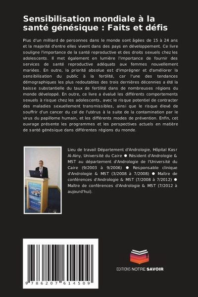 Plus d'un milliard de personnes dans le monde sont âgées de 15 à 24 ans et la majorité d'entre elles vivent dans des pays en développement. Ce livre souligne l'importance de la santé reproductive et des droits sexuels chez les adolescents. Il met également en lumière l'importance de fournir des services de santé reproductive adéquats aux femmes nouvellement mariées. En outre, la priorité absolue est d'imprégner et d'améliorer la sensibilisation du public à la fertilité, car l'une des tendances démographiques les plus redoutables des trois dernières décennies a été la baisse substantielle du taux de fertilité dans de nombreuses régions du monde développé. En outre, ce livre a évalué les différents comportements sexuels à risque chez les adolescents, avec le risque potentiel de contracter des maladies sexuellement transmissibles, ainsi que le risque élevé de souffrir d'un cancer du col de l'utérus à la suite de la contamination par le virus du papillome humain, et les différents modes de prévention. Enfin, cet ouvrage présente les programmes et les perspectives actuels en matière de santé génésique dans différentes régions du monde.