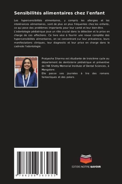Les hypersensibilités alimentaires, y compris les allergies et les intolérances alimentaires, sont de plus en plus fréquentes chez les enfants, ce qui pose des problèmes importants pour leur santé et leur bien-être.L'odontologie pédiatrique joue un rôle crucial dans la détection et la prise en charge de ces affections. Ce livre vise à fournir une revue complète des hypersensibilités alimentaires, en se concentrant sur leur prévalence, leurs manifestations cliniques, leur diagnostic et leur prise en charge dans le cadrede l'odontologie.