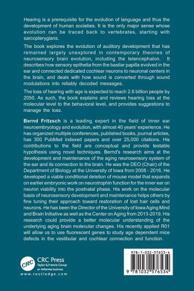 The book describes the molecular and genetic development of the auditory system in the ear that connects fibers to the brainstem, midbrain, and cortex. Age related hearing loss is reviewed.