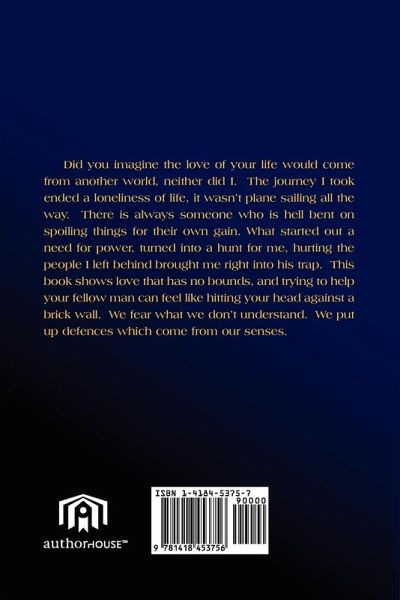 Did you imagine the love of your life would come from another world, neither did I. The journey I took ended a loneliness of life, it wasn't plane sailing all the way. There is always someone who is hell bent on spoiling things for their own gain. What started out a need for power, turned into a hunt for me, hurting the people I left behind brought me right into his trap. This book shows loves that has no bounds, and trying to help your fellow man can feel like hitting your head against a brick wall. We fear what we don't understand. We put up defences which come from out senses.