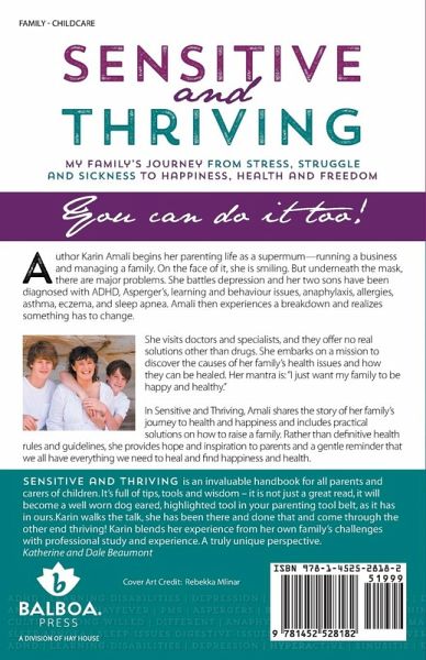 Author Karin Amali begins her parenting life as a supermum-running a business and managing a family. On the face of it, she is smiling. But underneath the mask, there are major problems. She battles depression and her two sons have been diagnosed with ADHD, Asperger's, learning and behaviour issues, anaphylaxis, allergies, asthma, eczema, and sleep apnea. Amali then experiences a breakdown and realizes something has to change. She visits doctors and specialists, and they offer no real solutions other than drugs. She embarks on a mission to discover the causes of her family's health issues and how they can be healed. Her mantra is: "I just want my family to be happy and healthy." In Sensitive and Thriving, Amali shares the story of her family's journey to health and happiness and includes practical solutions on how to raise a family. Rather than definitive health rules and guidelines, she provides hope and inspiration to parents and a gentle reminder that we all have everything we need to heal and find happiness and health.