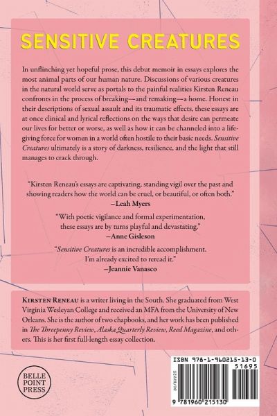 In unflinching yet hopeful prose, this debut memoir in essays explores the most animal parts of our human nature. Discussions of various creatures in the natural world serve as portals to the painful realities Kirsten Reneau confronts in the process of breaking-and remaking-a home. Honest in their descriptions of sexual assault and its traumatic effects, these essays are at once clinical and lyrical reflections on the ways that desire can permeate our lives for better or worse, as well as how it can be channeled into a lifegiving force for women in a world often hostile to their basic needs. Sensitive Creatures ultimately is a story of darkness, resilience, and the light that still manages to crack through.