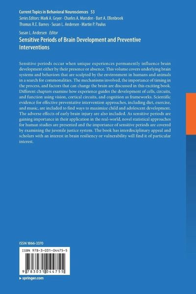 Sensitive periods occur when unique experiences permanently influence brain development either by their presence or absence. This volume covers underlying brain systems and behaviors that are sculpted by the environment in humans and animals in a search for commonalities. The mechanisms involved, the importance of timing in the process, and factors that can change the brain are discussed in this exciting book. Different chapters examine how experience guides the development of cells, circuits, and function using vision, cortical circuits, and cognition as frameworks. Scientific evidence for effective preventative intervention approaches, including diet, exercise, and music, are included to find ways to maximize child and adolescent development. The adverse effects of early brain injury are also included. As sensitive periods are gaining importance in their application in the real-world, novel statistical approaches for human studies are presented and the importance of sensitive periodsare covered by examining the juvenile justice system. The book has interdisciplinary appeal and scholars with an interest in brain resiliency or vulnerability will find it of particular interest.