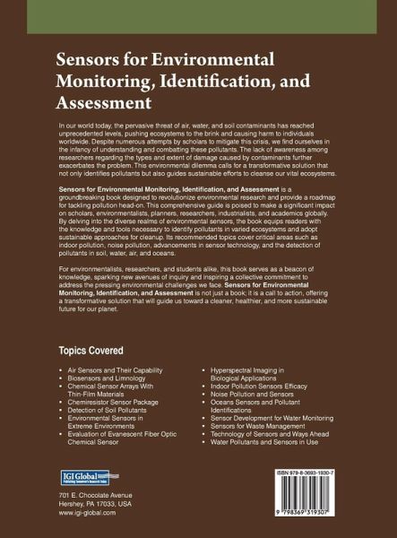 In our world today, the pervasive threat of air, water, and soil contaminants has reached unprecedented levels, pushing ecosystems to the brink and causing harm to individuals worldwide. Despite numerous attempts by scholars to mitigate this crisis, we find ourselves in the infancy of understanding and combatting these pollutants. The lack of awareness among researchers regarding the types and extent of damage caused by contaminants further exacerbates the problem. This environmental dilemma calls for a transformative solution that not only identifies pollutants but also guides sustainable efforts to cleanse our vital ecosystems. Sensors for Environmental Monitoring, Identification, and Assessment is a groundbreaking book designed to revolutionize environmental research and provide a roadmap for tackling pollution head-on. This comprehensive guide is poised to make a significant impact on scholars, environmentalists, planners, researchers, industrialists, and academics globally. By delving into the diverse realms of environmental sensors, the book equips readers with the knowledge and tools necessary to identify pollutants in varied ecosystems and adopt sustainable approaches for cleanup. Its recommended topics cover critical areas such as indoor pollution, noise pollution, advancements in sensor technology, and the detection of pollutants in soil, water, air, and oceans.