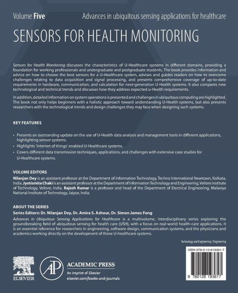 Sensors for Health Monitoring discusses the characteristics of U-Healthcare systems in different domains, providing a foundation for working professionals and undergraduate and postgraduate students. The book provides information and advice on how to choose the best sensors for a U-Healthcare system, advises and guides readers on how to overcome challenges relating to data acquisition and signal processing, and presents comprehensive coverage of up-to-date requirements in hardware, communication and calculation for next-generation uHealth systems. It then compares new technological and technical trends and discusses how they address expected u-Health requirements.