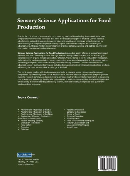 Despite the critical role of sensory science in ensuring food quality and safety, there needs to be more comprehensive educational resources that cover the breadth and depth of this field. Current literature often focuses on isolated aspects, leaving scholars and practitioners needing a unified reference for understanding the complex interplay of sensory organs, evaluation techniques, and technological advancements. This gap hinders the development of skilled sensory panelists and restricts innovation in food product development and quality control. Sensory Science Applications for Food Production bridges this gap by offering a comprehensive and cohesive overview of sensory science. Through its meticulously crafted chapters, the book thoroughly explores sensory organs, including Gustation, Olfaction, Vision, Sense of touch, and Auditory Perception. It elucidates the mechanisms behind sensory perception, examines abnormalities, and discusses factors influencing perception, all crucial for training proficient sensory panelists. The book also delves into advanced sensory evaluation techniques, including their application in developing innovative food products, addressing the need for up-to-date knowledge in the field.