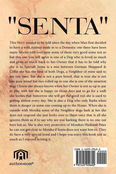 This Story needed to be told since the day when Man first decided to have a wild Animal made in to a Domestic one there have been many Stories told over time some of them very good some not so but this one you will agree is one of a Dog who is loved so much and gives so much back to her Owner that it has to be told why she is so Special! Senta is a mix between German Sheppard and Collie she has the best of both Dogs, a Neighbor of mine said to be one time, but she is not a pure breed, that is true she is not one pure breed but two rolled up in one she is one of the smartest dogs I know she always knows when her Owner is not so up to par to play with her she is happy on those days just to go for a walk she knows that tomorrow she will get the good run she is used to getting almost every day. She is also a Dog who only Barks when there is danger or some one coming up to the House. When she is outside with Monika some of the Neighbor dogs bark at her she does not respond she just looks over to them once that is all she ignores them as if to say why are you barking there is no one out here but us. She is also very protective of Monika's Husband Peter he can not get close to Monika if Senta does not want him to. They do have a very special bond and I hope you enjoy this book just as much as I enjoyed writing it.