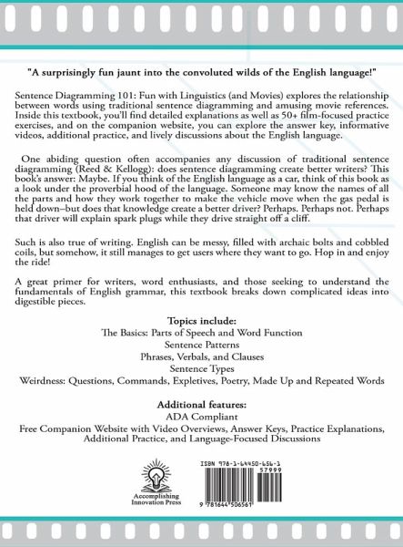 "A surprisingly fun jaunt into the convoluted wilds of the English language!" Sentence Diagramming 101: Fun with Linguistics (and Movies) explores the relationship between words using traditional sentence diagramming and amusing movie references. Inside this textbook, you'll find detailed explanations as well as 50+ film-focused practice exercises, and on the companion website, you can explore the answer key, informative videos, additional practice, and lively discussions about the English language. One abiding question often accompanies any discussion of traditional sentence diagramming (Reed & Kellogg): does sentence diagramming create better writers? This book's answer: Maybe. If you think of the English language as a car, think of this book as a look under the proverbial hood of the language. Someone may know the names of all the parts and how they work together to make the vehicle move when the gas pedal is held down-but does that knowledge create a better driver? Perhaps. Perhaps not. Perhaps that driver will explain spark plugs while they drive straight off a cliff. Such is also true of writing. English can be messy, filled with archaic bolts and cobbled coils, but somehow, it still manages to get users where they want to go. Hop in and enjoy the ride! A great primer for writers, word enthusiasts, and those seeking to understand the fundamentals of English grammar, this textbook breaks down complicated ideas into digestible pieces. Topics include: - The Basics: Parts of Speech and Word Function - Sentence Patterns - Phrases, Verbals, and Clauses - Sentence Types - Weirdness: Questions, Commands, Expletives, Poetry, Made Up and Repeated Words Additional features: ADA Compliant Free Companion Website with Video Overviews, Answer Keys, Practice Explanations, Additional Practice, and Language- Focused Discussions