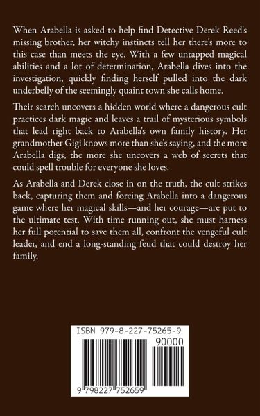 When Arabella is asked to help find Detective Derek Reed's missing brother, her witchy instincts tell her there's more to this case than meets the eye. With a few untapped magical abilities and a lot of determination, Arabella dives into the investigation, quickly finding herself pulled into the dark underbelly of the seemingly quaint town she calls home. Their search uncovers a hidden world where a dangerous cult practices dark magic and leaves a trail of mysterious symbols that lead right back to Arabella's own family history. Her grandmother Gigi knows more than she's saying, and the more Arabella digs, the more she uncovers a web of secrets that could spell trouble for everyone she loves. As Arabella and Derek close in on the truth, the cult strikes back, capturing them and forcing Arabella into a dangerous game where her magical skills-and her courage-are put to the ultimate test. With time running out, she must harness her full potential to save them all, confront the vengeful cult leader, and end a long-standing feud that could destroy her family.