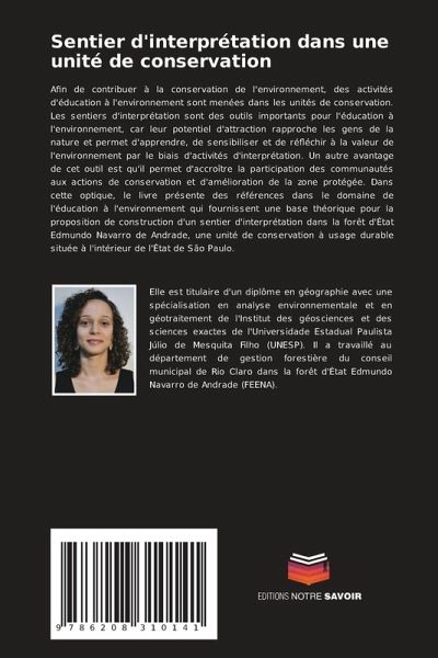 Afin de contribuer à la conservation de l'environnement, des activités d'éducation à l'environnement sont menées dans les unités de conservation. Les sentiers d'interprétation sont des outils importants pour l'éducation à l'environnement, car leur potentiel d'attraction rapproche les gens de la nature et permet d'apprendre, de sensibiliser et de réfléchir à la valeur de l'environnement par le biais d'activités d'interprétation. Un autre avantage de cet outil est qu'il permet d'accroître la participation des communautés aux actions de conservation et d'amélioration de la zone protégée. Dans cette optique, le livre présente des références dans le domaine de l'éducation à l'environnement qui fournissent une base théorique pour la proposition de construction d'un sentier d'interprétation dans la forêt d'État Edmundo Navarro de Andrade, une unité de conservation à usage durable située à l'intérieur de l'État de São Paulo.