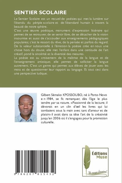 Le Sentier Scolaire est un recueil de poésies qui met la lumière sur l'étendu du périple scolaire et de l'étendard humain à travers la beauté de notre sphère.C'est une oeuvre poétique, monument d'expression littéraire qui permet de se retrouver, de se sentir libre, de se détacher de la vision insoumise et aussi de s'accouder aux enseignements pédagogiques populaires; c'est le ressort du rêve, de la pensée et parfois du regard.De la valeur substantielle à l'émotion la poésie crée en nous une chose hors du doute; elle met l'enfant dans une certitude de l'art créatif, pond la sincérité et la diversité des mesures. La poésie est au croisement de la maîtrise de la langue et de l'enseignement artistique; elle permet de solliciter la langue autrement. C'est un genre qui permet aux élèves de jouer avec les mots et de questionner leur rapport au langage. Et tout ceci dans une perspective ludique.