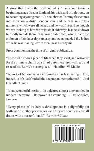 A story that traces the boyhood of a "man about town" - beginning at age five, in England, his trials and tribulations, on to becoming a young man. The celebrated Tommy first comes into view on a dirty London stair and he was in sexless garments which were all he had and he was five and so though we are looking at him we must do it sideways lest he sit down hurriedly to hide them. That inscrutable face, which made the clubmen of his later days uneasy and even puzzled the ladies while he was making love to them, was already his. Press comments at the time of original publication: "Those who know a piece of life when they see it, and who care for the ultimate charm of a bit of pure literature, will read and re-read Mr. Barrie's masterpiece." - Hamilton W. Mabie "A work of fiction that is as original as it is fascinating. Here, indeed, is life itself and all the accompaniments thereof." - Joel Chandler Harris "It has wonderful merits ... In a degree almost unexampled in modern literature ... Its power is astounding." - The Speaker, London "Every phase of its hero's development is delightfully set forth; and the other personages - and they are countless - are all drawn with a master's hand." - New York Times