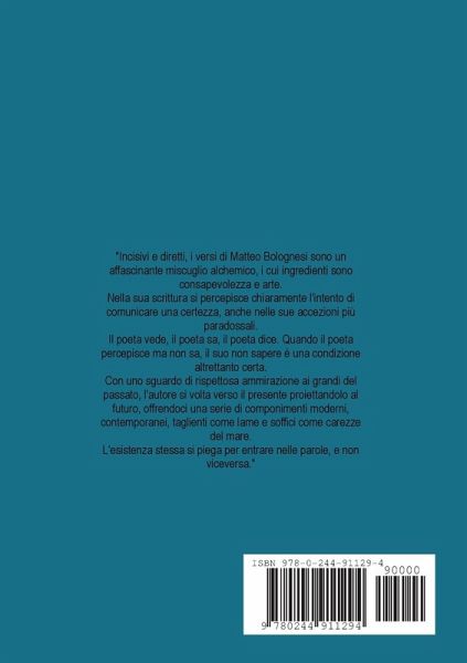 "incisivi e diretti, i versi di Matteo Bolognesi sono un affascinante miscuglio alchemico, i cui ingredienti sono consapevolezza e arte. Nella sua scrittura si percepisce chiaramente l'intento di comunicare una certezza, anche nelle sue accezioni più paradossali. Il poeta vede, il poeta sa, il poeta dice. Quando il poeta percepisce ma non sa, il suo non sapere è una condizione altrettanto certa. Con uno sguardo di rispettosa ammirazione ai grandi del passato, l'autore si volta verso il presente proiettandolo al futuro, offrendoci una serie di componimenti moderni, contemporanei, taglienti come lame e soffici come carezze del mare. L'esistenza stessa si piega per entrare nelle parole, e non viceversa."