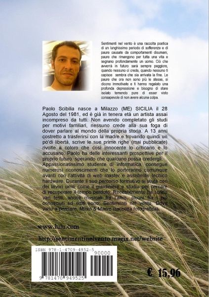 Paolo Scibilia nasce a Milazzo (ME) SICILIA il 28 Agosto ed è già in tenera età un artista assai incompreso da tutti. Non avendo completato gli studi per motivi familiari, nessuno crede alla sua foga di dover parlare al mondo della propria storia. A 13 anni costretto a trasferirsi con la madre e trovando quindi un po'di libertà, scrive le sue prime righe (mai pubblicate) rivolte a coloro che così innocente lo criticano e lo accusano. Paolo ha delle interessanti prospettive per il proprio futuro sperando che qualcuno possa credergli. Durante il suo percorso formativo si aiuta con dei lavori umili come il giardiniere e studia per cercare di recuperare il tempo perduto. Recentemente ha scritto vari testi, anche musicali fra l'altro, alcuni fra i più conosciuti ed editi sono: Sentimenti nel vento, Dove vado a pensare, Micro & Macro (raccolta fotografica).
