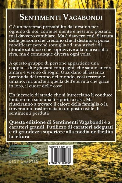 C'è un percorso prestabilito dal destino per ognuno di noi, come se niente e nessuno possano mai davvero cambiare. Ma è davvero così. Si tratta delle persone che credono che il destino si possa modificare perché somiglia ad una striscia di litorale sabbioso che sopravvive alla marea sulla riva, ma è comunque diversa ogni volta. A questo gruppo di persone appartiene una coppia - due giovani compagni, che sanno ancora amare e vivono di sogni. Guardano all'essenza profonda del tempo del mondo, così terreno e umano, ma anche a quella dell'eternità che giace in loro, il cuore delle cose. Un incrocio di strade che si intrecciano li conduce lontano ma solo una li riporta a casa. Ma riusciranno a trovare il calore della famiglia o la troveranno trasformata in un posto ostile di sentimenti perduti? Questa è l'edizione a stampa grande di Sentimenti Vagabondi, con un carattere più grande / typeface per una lettura più facile.