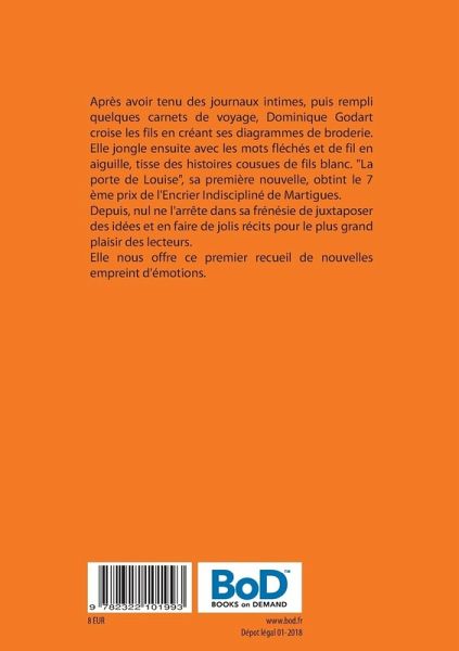Après avoir tenu des journaux intimes, puis rempli quelques carnets de voyage, Dominique Godart croise les fils en créant ses diagrammes de broderie. Elle jongle ensuite avec les mots fléchés et de fil en aiguille, tisse des histoires cousues de fils blanc. "La porte de Louise", sa première nouvelle, obtint le 7 ème prix de l'Encrier Indiscipliné de Martigues.Depuis, nul ne l'arrête dans sa frénésie de juxtaposer des idées et en faire de jolis récits pour le plus grand plaisir des lecteurs.Elle nous offre ce premier recueil de nouvelles empreint d'émotions.