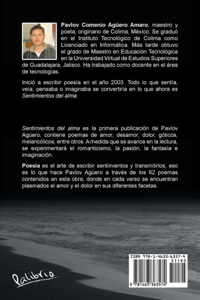 Pavlov Comenio Agüero Amaro, maestro y poeta, originario de Colima, México. Se graduó en el Instituto Tecnológico de Colima como Licenciado en Informática. Más tarde obtuvo el grado de Maestro en Educación Tecnológica en la Universidad Virtual de Estudios Superiores de Guadalajara, Jalisco. Ha trabajado como docente en el área de tecnologías. Inició a escribir poesía en el año 2003. Todo lo que sentía, veía, pensaba o imaginaba se convertiría en lo que ahora es Sentimientos del alma.
