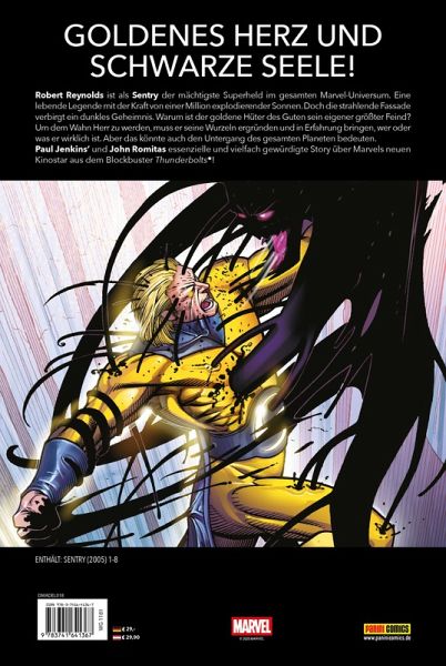 GOLDENES HERZ UND SCHWARZE SEELE! Robert Reynolds ist als Sentry der mächtigste Superheld im gesamten Marvel-Universum. Eine lebende Legende mit der Kraft von einer Million explodierender Sonnen. Doch die strahlende Fassade verbirgt ein dunkles Geheimnis. Warum ist der goldene Hüter des Guten sein eigener größter Feind? Um dem Wahn Herr zu werden, muss er seine Wurzeln ergründen und in Erfahrung bringen, wer oder was er wirklich ist. Aber das könnte auch den Untergang des gesamten Planeten bedeuten. Paul Jenkins' und John Romitas essenzielle und vielfach gewürdigte Story über Marvels neuen Kinostar aus dem Blockbuster Thunderbolts_! ENTHÄLT: SENTRY (2005) 1-8