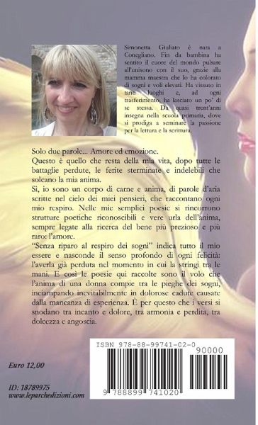 Solo due parole... Amore ed emozione. Questo è quello che resta della mia vita, dopo tutte le battaglie perdute, le ferite sterminate e indelebili che solcano la mia anima. Sì, io sono un corpo di carne e anima, di parole d'aria scritte nel cielo dei miei pensieri, che raccontano ogni mio respiro. Nelle mie semplici poesie si rincorrono strutture poetiche riconoscibili e vere urla dell'anima, sempre legate alla ricerca del bene più prezioso e più raro: l'amore. "Senza riparo al respiro dei sogni" indica tutto il mio essere e nasconde il senso profondo di ogni felicità: l'averla già perduta nel momento in cui la stringi tra le mani. E così le poesie qui raccolte sono il volo che l'anima di una donna compie tra le pieghe dei sogni, inciampando inevitabilmente in dolorose cadute causate dalla mancanza di esperienza. È per questo che i versi si snodano tra incanto e dolore, tra armonia e perdita, tra dolcezza e angoscia.