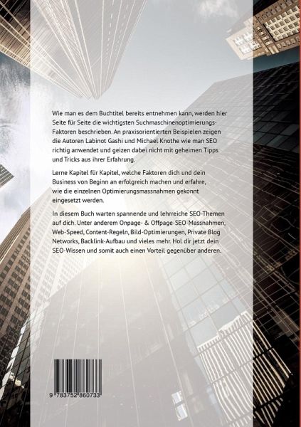 SEO, SEO, SEO und nicht als SEO. Wie es der Buch-Name bereits sagt, werden hier Seiten für Seiten die wichtigsten Suchmaschinenoptimierungs-Faktoren beschrieben. An praxisorientierten Beispielen zeigen die Autoren Labinot Gashi und Michael Knothe wie man SEO richtig anwendet und geizen dabei nicht mit geheimen Tipps und Tricks aus ihrer Erfahrung. Lerne Kapitel für Kapitel, welche Faktoren dich und dein Business von Beginn an erfolgreich machen und erfahre wie die einzelnen Optimierungsmassnahmen gekonnt eingesetzt werden. In diesem Buch warten spannende und lehrreiche SEO-Themen auf dich. Unter anderem Onpage- & Offpage-SEO-Massnahmen, Web-Speed, Content-Regeln, Bilder-Optimierungen, Private Blog Networks, Backlink-Aufbau und vieles mehr. Hol dir jetzt dein SEO-Wissen und somit auch einen Vorteil gegenüber anderen.