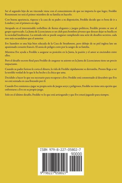 Ser el segundo hijo de un vizconde viene con el conocimiento de que no importa lo que logre; Freddie Rosemount no será el primer miembro de su familia en hacerlo. Con buena apariencia, riqueza y la casa de su padre a su disposición, Freddie decide que es hora de ir a Londres y ser el primero en algo. Atrapado en el interminable torbellino de fiestas elegantes y juegos políticos, Freddie pronto se une al grupo equivocado. La Junta de Licenciatura es un club para hombres jóvenes que desean dejar su huella en la sociedad londinense. La entrada solo se puede asegurar cumpliendo una serie de desafíos secretos, cada uno más escandaloso que el anterior. Eve Saunders es una hija bien educada de la Casa de Strathmore, pero debajo de su piel inglesa late un apasionado corazón francés. El ansia de peligro corre por la sangre de su familia. Mientras Eve ayuda a Freddie a asegurar su posición en la Junta, la pasión y el amor se encienden entre ellos. Pero el desafío secreto final para Freddie de asegurar su asiento en la Junta de Licenciatura tiene un precio impactante. Cuando su padre furioso le corta el dinero, la vida de Freddie rápidamente se derrumba. Pronto llega a ver la terrible verdad de lo que le ha hecho a la chica que ama. Decidido a hacer lo que sea necesario para recuperar a Eve; Freddie está consternado al descubrir que Eve no está sentada en casa llorando por él. Cuando Eve comienza a jugar su propia serie de juegos sexys y peligrosos, Freddie no tiene otra opción que enfrentarse a Eve en su propio juego. Solo en el último desafío, Freddie ve lo que está arriesgando y que Eve estará jugando para siempre.