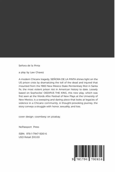 Señora de la Pinta. a play by Law Chavez. This play re-imagines Sophocles' OEDIPUS THE KING in a Chicano community in New Mexico. A sweeping and daring play that makes a welcome addition to the growing body of work of US Latine/x literature and its intersections with the classics. This is a NoPassport Press publication.