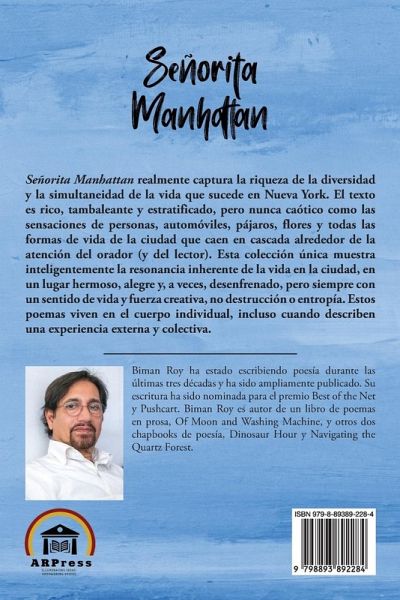 Señorita Manhattan realmente captura la riqueza de la diversidad y la simultaneidad de la vida que sucede en Nueva York. El texto es rico, tambaleante y estratificado, pero nunca caótico como las sensaciones de personas, automóviles, pájaros, flores y todas las formas de vida de la ciudad que caen en cascada alrededor de la atención del orador (y del lector). Esta colección única muestra inteligentemente la resonancia inherente de la vida en la ciudad, en un lugar hermoso, alegre y, a veces, desenfrenado, pero siempre con un sentido de vida y fuerza creativa, no destrucción o entropía. Estos poemas viven en el cuerpo individual, incluso cuando describen una experiencia externa y colectiva. Biman Roy ha estado escribiendo poesía durante las últimas tres décadas y ha sido ampliamente publicado. Su escritura ha sido nominada para el premio Best of the Net y Pushcart. Biman Roy es autor de un libro de poemas en prosa, Of Moon and Washing Machine, y otros dos chapbooks de poesía, Dinosaur Hour y Navigating the Quartz Forest.
