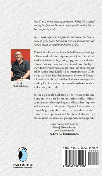 No, Q was not a mere coincidence. Kajal felt a rapid pining for Q to see his work. He urgently needed her to. He was finally ready. Q.....That night when I gave her the name, she had no voice or eyes or ears. She wasn't even an animal. She was just an object. A motif that defined a clan. Three individuals - resolute minded Doctor, seemingly self-assured relationship-hopper Q and Kajal, an academic failure with growing-up ghosts - are thrown into a tryst with circumstances, and layer by layer, they discover themselves more than they unravel each other. As fate leads Kajal's life to intertwine with Q's in a way that both find their spaces in the world, Doctor is forced to face brutal realities of his own inadequacies, sending his life spiraling downward into darkness while still seeking the truth. Set in a palpable backdrop of northeast India and London, the non-linear narrative builds minor culminations while rippling to a climax that surprises and leaves a mixed after-taste. Separate Lives weaves the compelling tale of three everyday individuals as their distinct pasts, presents and futures collide, even as chance is the simultaneous protagonist and antagonist.
