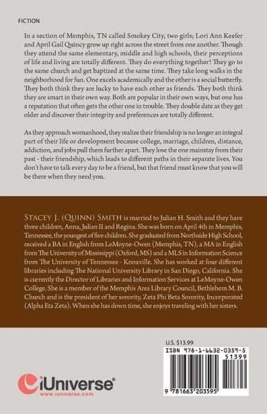 In a section of Memphis, TN called Smokey City, two girls; Lori Ann Keefer and April Gail Quincy grow up right across the street from one another. Though they attend the same elementary, middle and high schools, their perceptions of life and living are totally different. They do everything together! They go to the same church and get baptized at the same time. They take long walks in the neighborhood for fun. One excels academically and the other is a social butterfly. They both think they are lucky to have each other as friends. They both think they are smart in their own way. Both are popular in their own ways, but one has a reputation that often gets the other one in trouble. They double date as they get older and discover their integrity and preferences are totally different. As they approach womanhood, they realize their friendship is no longer an integral part of their life or development because college, marriage, children, distance, addiction, and jobs pull them further apart. They lose the one mainstay from their past - their friendship, which leads to different paths in their separate lives. You don't have to talk every day to be a friend, but that friend must know that you will be there when they need you.