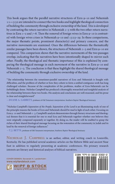 This book argues that the parallel narrative structures of Ezra 9-10 and Nehemiah 1:1--3:32 are intended to connect the two books and highlight theological connection of building the community through exclusive ownership of the land. This is developed by contrasting the return narrative in Nehemiah 1-3 with the two other return narratives in Ezra 1-2 and 7-8. Then the removal of foreign wives in Ezra 9-10 is contrasted with foreign wives crises in Nehemiah 9-10 and 13:23-29. In these comparisons, the major thematic points, prominent character(s) and primary concern, and the narrative movements are examined. Once the differences between the thematically similar passages have been shown, the structures of Nehemiah 1-3 and Ezra 9-10 are compared. This comparison shows that the narrative movements of the two passages overlap, indicating that the narratives have been intentionally shaped to mirror each other. Finally, the theological and thematic importance of this is explained by comparing the theological message in each movement of the narrative in Ezra 9-10 and Nehemiah 1-3. The conclusion is that these highlight the shared theological message of building the community through exclusive ownership of the land.