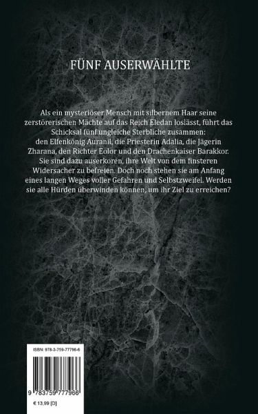 FÜNF AUSERWÄHLTE Als ein mysteriöser Mensch mit silbernem Haar seine zerstörerischen Mächte auf das Reich Eledan loslässt, führt das Schicksal fünf ungleiche Sterbliche zusammen: den Elfenkönig Auranil, die Priesterin Adalia, die Jägerin Zharana, den Richter Eolor und den Drachenkaiser Barakkor. Sie sind dazu auserkoren, ihre Welt von dem finsteren Widersacher zu befreien. Doch noch stehen sie am Anfang eines langen Weges voller Gefahren und Selbstzweifel. Werden sie alle Hürden überwinden können, um ihr Ziel zu erreichen?