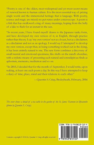 "Poetry is one of the oldest, most widespread and yet most secret means of renewal known to human culture. It is the most essential way of prizing single words and the immemorial heritage that is language. With poetry, science and magic are mixed; we put runes under a microscope. A poem is a fish that has swallowed a ring of many meanings, leaping from the belly of a lake to flash for an instant in the sun. "In recent years, I have found myself drawn to the Japanese tanka form, and have developed my own version of it, in English, through practice rather than theory. I say 'my own version' not as a boast, but as a disclaimer; as a disclaimer and not as an apology. I would say I 'attempted' to develop my own version, except that, in being something worked out in the doing, it has been entirely natural to me. The new form combines a discovery of small mental and emotional specimens, like shells on the mind's shoreline, with a stylistic means of presenting such natural and serendipitous finds as aphorism, memento, meditation and so on. "In 2015, I decided that for the month of September, I would write, upon waking, at least one such poem a day. In this way I have attempted to keep a diary of time, place, mind and their relations to each other." Quentin S. Crisp, Bexleyheath, February, 2016