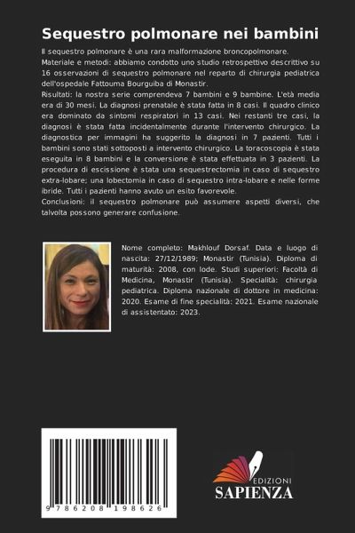 Il sequestro polmonare è una rara malformazione broncopolmonare.Materiale e metodi: abbiamo condotto uno studio retrospettivo descrittivo su 16 osservazioni di sequestro polmonare nel reparto di chirurgia pediatrica dell'ospedale Fattouma Bourguiba di Monastir.Risultati: la nostra serie comprendeva 7 bambini e 9 bambine. L'età media era di 30 mesi. La diagnosi prenatale è stata fatta in 8 casi. Il quadro clinico era dominato da sintomi respiratori in 13 casi. Nei restanti tre casi, la diagnosi è stata fatta incidentalmente durante l'intervento chirurgico. La diagnostica per immagini ha suggerito la diagnosi in 7 pazienti. Tutti i bambini sono stati sottoposti a intervento chirurgico. La toracoscopia è stata eseguita in 8 bambini e la conversione è stata effettuata in 3 pazienti. La procedura di escissione è stata una sequestrectomia in caso di sequestro extra-lobare; una lobectomia in caso di sequestro intra-lobare e nelle forme ibride. Tutti i pazienti hanno avuto un esito favorevole.Conclusioni: il sequestro polmonare può assumere aspetti diversi, che talvolta possono generare confusione.