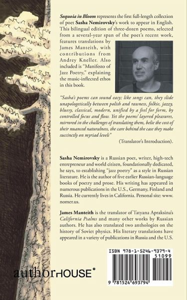 Sequoia in Bloom represents the first full-length collection of poet Sasha Nemirovsky?s work to appear in English. This bilingual edition of three-dozen poems, selected from a several-year span of the poet?s recent work, features translations by James Manteith, with contributions from Andrey Kneller. Also included is ?Manifesto of Jazz Poetry,? explaining the music-inflected ethos in this book. ?Sasha?s poems can sound easy; like songs can, they slide unapologetically between polish and rawness, folkie, jazzy, bluesy, classical, modern, unified by a feel for form, by controlled focus and flow. Yet the poems? layered pleasures, mirrored in the challenges of translating them, belie the cost of their nuanced naturalness, the care behind the case they make succinctly on myriad levels? (Translator?s Introduction).