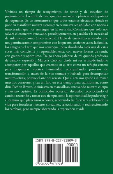 Vivimos un tiempo de recogimiento, de sentir y de escuchar, de preguntarnos el sentido de esto que nos amenaza y plantearnos hipótesis de respuestas. Es un momento en que todos estamos afectados, donde se pone en manifiesto nuestra esencia y crece nuestra sensibilidad con noticias innecesarias que nos sumergen en la oscuridad.Considero que solo nos salvará el encuentro renovado, paradójicamente, en paralelo a la necesidad de aislamiento como único remedio. Hablo de encuentro renovado, que nos permita asumir compromisos con lo que nos sostiene; ya sea la familia, los amigos o el arte que nos convoque; pero abordando cada una de estas cosas más consciente y responsablemente, con nuevas formas de sentir, con gratitud y optimismo. Traigo ahora palabras de mi querida profesora de canto y expresión, Marcela Cuomo: desde mi ser artistadejándome acompañar por aquellos que creemos en el arte como un refugio certero para desperezar nuestra humanidad acompañando procesos de transformación a través de la voz cantada y hablada para desempolvar nuestro artista; porque el arte nos rescata. Que el arte nos ayude a iluminar nuestros corazones y sea un faro en este tiempo para transformar, como diría Pichon Rivere, lo siniestro en maravilloso, renovando nuestro cuerpo y nuestro espíritu. Es purificador observar alrededor reconociendo el camino recorrido y tomar este tiempo como la oportunidad de poder elegir el camino que planeamos recorrer, renovando las fuerzas y celebrando la vida para fortalecer nuestros corazones, seleccionando y redireccionando los cambios; pero siempre abrazando la experiencia vivida.