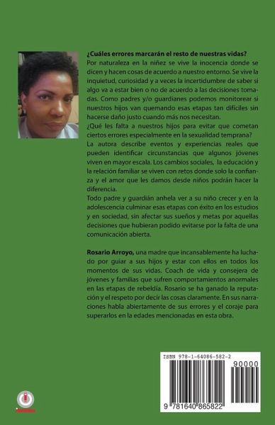 ¿Cuáles errores marcarán el resto de nuestras vidas? Por naturaleza en la niñez se vive la inocencia donde se dicen y hacen cosas de acuerdo a nuestro entorno. Se vive la inquietud, curiosidad y a veces la incertidumbre de saber si algo va a estar bien o no de acuerdo a las decisiones tomadas. Como padres y/o guardianes podemos monitorear si nuestros hijos van quemando esas etapas tan difíciles sin hacerse daño justo cuando más nos necesitan. ¿Qué les falta a nuestros hijos para evitar que cometan ciertos errores especialmente en la sexualidad temprana? La autora describe eventos y experiencias reales que pueden identificar circunstancias que algunos jóvenes viven en mayor escala. Los cambios sociales, la educación y la relación familiar se viven con retos donde solo la confianza y el amor que les damos desde niños podrán hacer la diferencia. Todo padre y guardián anhela ver a su niño crecer y en la adolescencia culminar esas etapas con éxito en los estudios y en sociedad, sin afectar sus sueños y metas por aquellas decisiones que hubieran podido evitarse por la falta de una comunicación abierta. Rosario Arroyo, una madre que incansablemente ha luchado por guiar a sus hijos y estar con ellos en todos los momentos de sus vidas. Coach de vida y consejera de jóvenes y familias que sufren comportamientos anormales en las etapas de rebeldía. Rosario se ha ganado la reputación y el respeto por decir las cosas claramente. En sus narraciones habla abiertamente de sus errores y el coraje para superarlos en la edades mencionadas en esta obra.