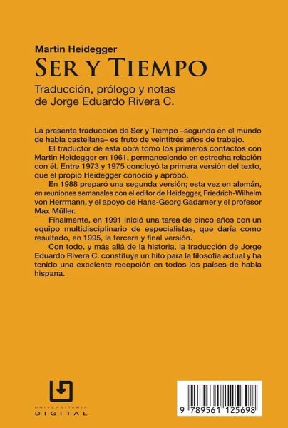 La presente traducci n de Ser y Tiempo -segunda en el mundo de habla castellana- es fruto de veintitr s a os de trabajo. El traductor de esta obra tom los primeros contactos con Martin Heidegger en 1961, permaneciendo en estrecha relaci n con l. Entre 1973 y 1975 concluy la primera versi n del texto, que el propio Heidegger conoci y aprob . En 1988 prepar una segunda versi n, esta vez en reuniones semanales con el editor de Heidegger en alem n, Friedrich-Wilhelm von Herrmann, y el apoyo de Hans-Georg Gadamer y del profesor Max M ller. Finalmente, en 1991 inici una tarea de cinco a os con un equipo multidisciplinario de especialistas, que dar a como resultado, en 1995, la tercera y final versi n. Con todo, y m s all de la historia, la traducci n de Jorge Eduardo Rivera C. constituye un hito para la filosof a actual y ha tenido una excelente recepci n en todos los pa ses de habla hispana.