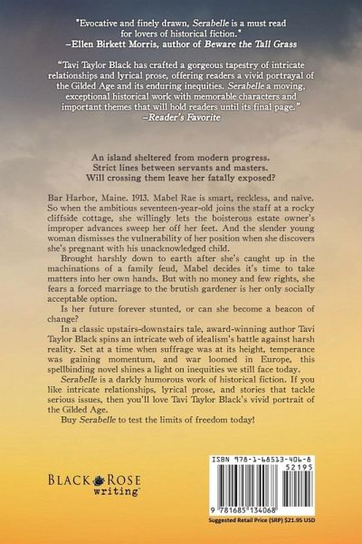 An island sheltered from modern progress. Strict lines between servants and masters. Will crossing them leave her fatally exposed? Bar Harbor, Maine. 1913. Mabel Rae is smart, reckless, and naïve. So when the ambitious seventeen-year-old joins the staff at a rocky cliffside cottage, she willingly lets the boisterous estate owner's improper advances sweep her off her feet. And the slender young woman dismisses the vulnerability of her position when she discovers she's pregnant with his unacknowledged child. Brought harshly down to earth after she's caught up in the machinations of a family feud, Mabel decides it's time to take matters into her own hands. But with no money and few rights, she fears a forced marriage to the brutish gardener is her only socially acceptable option. Is her future forever stunted, or can she become a beacon of change? In a classic upstairs-downstairs tale, award-winning author Tavi Taylor Black spins an intricate web of idealism's battle against harsh reality. Set at a time when suffrage was at its height, temperance was gaining momentum, and war loomed in Europe, this spellbinding novel shines a light on inequities we still face today. Serabelle is a darkly humorous work of historical fiction. If you like intricate relationships, lyrical prose, and stories that tackle serious issues, then you'll love Tavi Taylor Black's vivid portrait of the Gilded Age. Buy Serabelle to test the limits of freedom today!