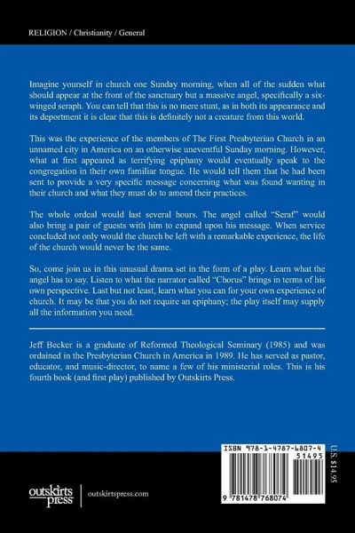 Imagine yourself in church one Sunday morning, when all of the sudden what should appear at the front of the sanctuary but a massive angel, specifically a six-winged seraph. You can tell that this is no mere stunt, as in both its appearance and its deportment it is clear that this is definitely not a creature from this world. This was the experience of the members of The First Presbyterian Church in an unnamed city in America on an otherwise uneventful Sunday morning. However, what at first appeared as terrifying epiphany would eventually speak to the congregation in their own familiar tongue. He would tell them that he had been sent to provide a very specific message concerning what was found wanting in their church and what they must do to amend their practices. The whole ordeal would last several hours. The angel called "Seraf" would also bring a pair of guests with him to expand upon his message. When service concluded not only would the church be left with a remarkable experience, the life of the church would never be the same. So, come join us in this unusual drama set in the form of a play. Learn what the angel has to say. Listen to what the narrator called "Chorus" brings in terms of his own perspective. Last but not least, learn what you can for your own experience of church. It may be that you do not require an epiphany; the play itself may supply all the information you need.