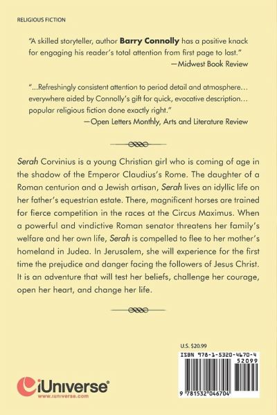 Serah Corvinius is a young Christian girl who is coming of age in the shadow of the Emperor Claudiuss Rome. The daughter of a Roman centurion and a Jewish artisan, Serah lives an idyllic life on her fathers equestrian estate. There, magnificent horses are trained for fierce competition in the races at the Circus Maximus. When a powerful and vindictive Roman senator threatens her familys welfare and her own life, Serah is compelled to flee to her mothers homeland in Judea. In Jerusalem, she will experience for the first time the prejudice and danger facing the followers of Jesus Christ. It is an adventure that will test her beliefs, challenge her courage, open her heart, and change her life.