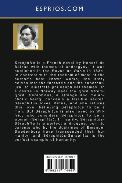 Séraphîta is a French novel by Honoré de Balzac with themes of androgyny. It was published in the Revue de Paris in 1834. In contrast with the realism of most of the author's best known works, the story delves into the fantastic and the supernatural to illustrate philosophical themes. In a castle in Norway near the fjord Stromfjord, Séraphitüs, a strange and melancholic being, conceals a terrible secret. Séraphitüs loves Minna, and she returns this love, believing Séraphitüs to be a man. But Séraphitüs is also loved by Wilfrid, who considers Séraphitüs to be a woman (Séraphîta). In reality, Séraphitüs- Séraphîta is a perfect androgyne, born to parents who by the doctrines of Emanuel Swedenborg have transcended their humanity, and Séraphitüs-Séraphîta is the perfect example of humanity.