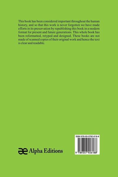 Serapis ,Volume 02, a classical and rare book that has been considered essential throughout human history, so that this work is never forgotten, we at Alpha Editions have made efforts in its preservation by republishing this book in a modern format for present and future generations. This whole book has been reformatted, retyped and designed. These books are not made of scanned copies of their original work and hence the text is clear and readable.