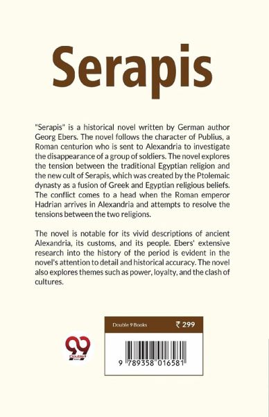 "Serapis" is a historical novel written by German author Georg Ebers. The novel follows the character of Publius, a Roman centurion who is sent to Alexandria to investigate the disappearance of a group of soldiers. The novel explores the tension between the traditional Egyptian religion and the new cult of Serapis, which was created by the Ptolemaic dynasty as a fusion of Greek and Egyptian religious beliefs. The conflict comes to a head when the Roman emperor Hadrian arrives in Alexandria and attempts to resolve the tensions between the two religions. The novel is notable for its vivid descriptions of ancient Alexandria, its customs, and its people. Ebers' extensive research into the history of the period is evident in the novel's attention to detail and historical accuracy. The novel also explores themes such as power, loyalty, and the clash of cultures.