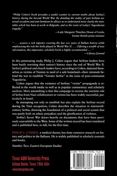 An entire piece of Serbian history is missing. And in the middle of the latest Yugoslav war-Europe's worst blood bath since World War II-Serbian politicians, propagandists, and revisionist historians have made a cynical attempt at replacing the missing piece by rewriting the Holocaust record: Serbs were not Nazi collaborators in genocide, but purely victims of the same atrocities that befell the Jews; and Serbian aspirations for a Greater Serbia are not driven by a murderous, nationalistic hatred, but rather are propelled by a victim's desire to lay claim to a safe homeland, a Serbian Promised Land. Thus has the current spilling of blood been justified. Philip J. Cohen argues that the existence of such a propaganda campaign, emanating from Belgrade, began in the earliest days of the post-World War II era and, since then, has been reflected in the world media, as well as in popular commentary and scholarly analysis. More astonishing is that this campaign has been widely successful, particularly in Israel. In attempting to not only establish but also explain the Serbian record during the Nazi occupation, Cohen takes his reader back into nineteenth-century Serbia to uncover the foundation of a political and social system that was partly built on ethnic prejudices and the glorification of violence. The rise of Serbian fascism in the 1930s was therefore inevitable-predetermined by the politics of power- and land-grabbing. Remarkable for its broad portrayal and penetrating examination of the Yugoslav social and political experience, Serbia at War with History draws heavily on documents that have been previously unavailable to the West. Some of the written record has been translated and is published here, in full, for the first time. Destined to be regarded as an important contribution to the field, Cohen's careful study of the Serbian role in the Second World War will dramatically alter how scholars, policy makers, and the general public view the bloodshed in the former Yugoslavia-and how they will come to understand the reasons behind it. Philip J. Cohen, a medical doctor, has done extensive research on history and politics in the Balkans. He is widely published in scholarly journals and books."Dr. Cohen's book is of unique value because it serves two vital purposes: to document the often misunderstood and misrepresented history of Serbian nationalism and Serbian collaboration with the Nazis and to expose some of the myths used by Serbian extremists today in the former Yugoslavia to justify a new round of genocide and `ethnic cleansing.' As a result, it will make the task of revisionists and war criminals all the more difficult.