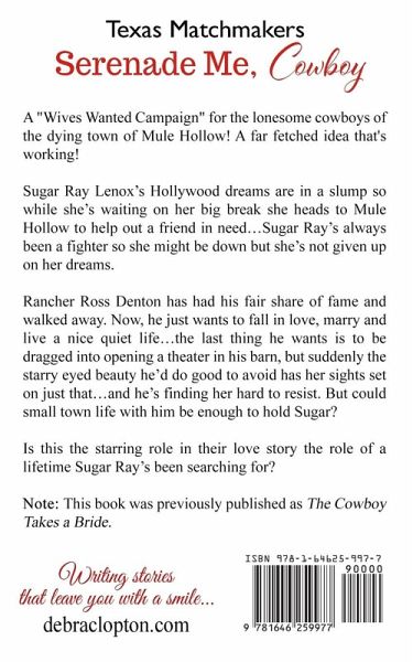 A "Wives Wanted Campaign" for the lonesome cowboys of the dying town of Mule Hollow! A far fetched idea that's working! Sugar Ray Lenox's Hollywood dreams are in a slump so while she's waiting on her big break she heads to Mule Hollow to help out a friend in need…Sugar Ray's always been a fighter so she might be down but she's not given up on her dreams. Rancher Ross Denton has had his fair share of fame and walked away. Now, he just wants to fall in love, marry and live a nice quiet life…the last thing he wants is to be dragged into opening a theater in his barn, but suddenly the starry eyed beauty he'd do good to avoid has her sights set on just that…and he's finding her hard to resist. But could small town life with him be enough to hold Sugar? Is this the starring role in their love story the role of a lifetime Sugar Ray's been searching for? Note: This book was previously published as The Cowboy Takes a Bride.