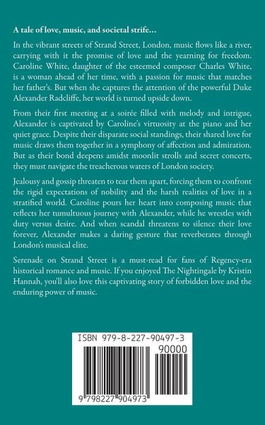 A tale of love, music, and societal strife... In the vibrant streets of Strand Street, London, music flows like a river, carrying with it the promise of love and the yearning for freedom. Caroline White, daughter of the esteemed composer Charles White, is a woman ahead of her time, with a passion for music that matches her father's. But when she captures the attention of the powerful Duke Alexander Radcliffe, her world is turned upside down. From their first meeting at a soirée filled with melody and intrigue, Alexander is captivated by Caroline's virtuosity at the piano and her quiet grace. Despite their disparate social standings, their shared love for music draws them together in a symphony of affection and admiration. But as their bond deepens amidst moonlit strolls and secret concerts, they must navigate the treacherous waters of London society. Jealousy and gossip threaten to tear them apart, forcing them to confront the rigid expectations of nobility and the harsh realities of love in a stratified world. Caroline pours her heart into composing music that reflects her tumultuous journey with Alexander, while he wrestles with duty versus desire. And when scandal threatens to silence their love forever, Alexander makes a daring gesture that reverberates through London's musical elite. Serenade on Strand Street is a must-read for fans of Regency-era historical romance and music. If you enjoyed The Nightingale by Kristin Hannah, you'll also love this captivating story of forbidden love and the enduring power of music.