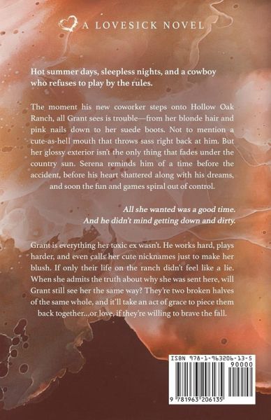 Hot summer days, sleepless nights, and a cowboy who refuses to play by the rules. The moment his new coworker steps onto Hollow Oak Ranch, all Grant sees is trouble-from her blonde hair and pink nails down to her suede boots. Not to mention a cute-as-hell mouth that throws sass right back at him. But her glossy exterior isn't the only thing that fades under the country sun. Serena reminds him of a time before the accident, before his heart shattered along with his dreams, and soon the fun and games spiral out of control. All she wanted was a good time. And he didn't mind getting down and dirty. Grant is everything her toxic ex wasn't. He works hard, plays harder, and even calls her cute nicknames just to make her blush. If only their life on the ranch didn't feel like a lie. When she admits the truth about why she was sent here, will Grant still see her the same way? They're two broken halves of the same whole, and it'll take an act of grace to piece them back together...or love, if they're willing to brave the fall.