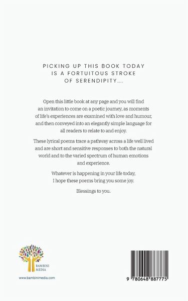 Picking up this book today is a fortuitous stroke of serendipity... Open this little book at any page and you will find an invitation to come on a poetic journey, as moments of life's experiences are examined with love and humour, and then conveyed into an elegantly simple language for all readers to relate to and enjoy. These lyrical poems trace a pathway across a life well lived and are short and sensitive responses to both the natural world and to the varied spectrum of human emotions and experience. Whatever is happening in your life today, I hope these poems bring you some joy. Blessings to you.