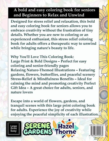 Relax and unwind with Adult Coloring Book Large Print Easy, a beautifully designed large print coloring book for adults that features bold and easy illustrations of nature, gardens, and floral designs. Perfect for seniors, beginners, and anyone seeking stress relief, this book provides simple yet stunning images to color at your own pace. Why You'll Love This Coloring Book: ¿ Large Print & Bold Designs - Perfect for easy coloring and senior-friendly pages ¿ Relaxing Nature-Themed Illustrations - Featuring gardens, flowers, butterflies, and peaceful scenery ¿ Stress-Relief & Mindfulness Benefits - Ideal for calming the mind and promoting creativity ¿ Perfect Gift Idea - A great choice for adults, seniors, and nature lovers Designed for stress relief and relaxation, this bold and easy coloring book for seniors allows you to embrace creativity without the frustration of tiny details. Whether you are new to coloring or an experienced enthusiast, this stress relief coloring book for adults offers a therapeutic way to unwind while bringing nature's beauty to life.
