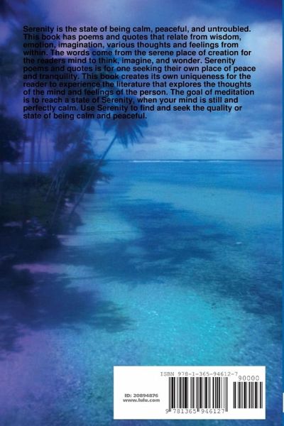 Serenity the state of being calm, peaceful, and untroubled. Serenity Poems and Quotes is about the different types of thoughts and emotions one has when seeking their once place of serenity. A place of peace and tranquility. This book holds uniqueness of being different from the same as others in its genre. This book has the literature it takes to create wonder in the mind. A place for the reader to think and explore ones own emotions and thoughts. A place to find ones own Serenity.